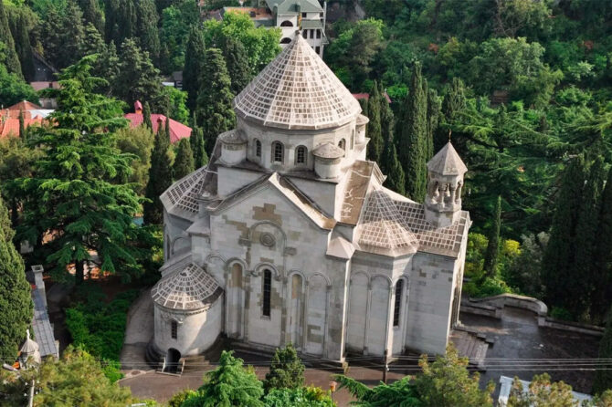 Это шедевр национальной архитектуры 20 века, построенный архитектором Тер — Микеловым. Роспись внешних и внутренних фасадов сделана армянским живописцем Суренянцем. Гости восторгаются фресками на куполе, а весь объем помещения прекрасно освещается через арочные окна.