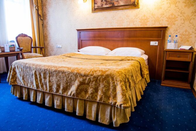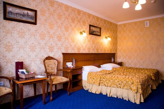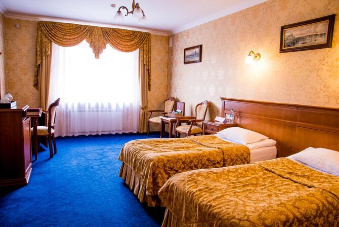 - «Улучшенные». В этих номерах дизайн выполнен в стиле московских гостиниц восемнадцатого века. В стандартный набор входит телефон, телевизор, кондиционер, мини-бар, фен, сейф, письменные принадлежности, набор для шитья, комплект средств индивидуальной гигиены и многое другое.