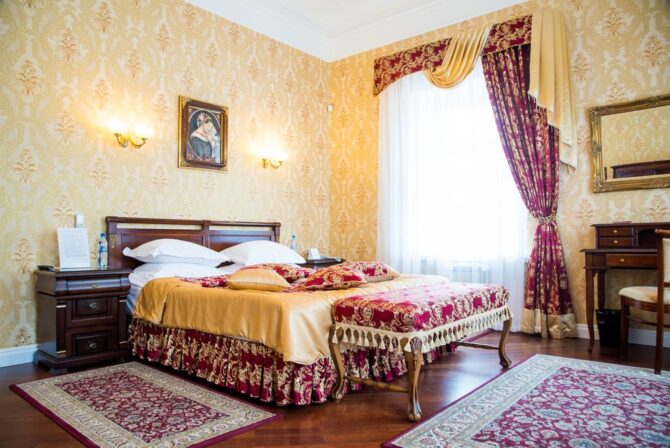 - Люкс – это красивейшие апартаменты с уникальным дизайном в стилистике русского дворянства 19 века. Мебель и убранство изготовлены из дорогостоящих натуральных материалов, поэтому при их порче вам придется выложить круглую сумму в счет компенсации за ущерб.
