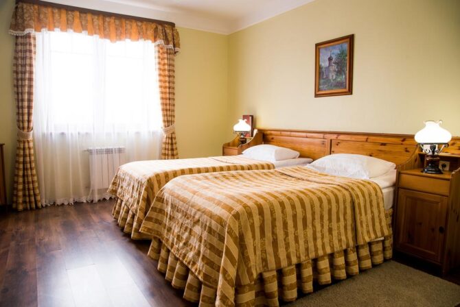 - Молодежный стандарт. Эти номера площадью 20 квадратных метров обойдется вам примерно 3700 рублей. В апартаментах есть телевизор, телефон, рабочая зона, гардеробная, полки для косметики, двуспальная кровать и мягкая зона. Предоставляются тапочки, полотенца и гигиенические принадлежности. Приятным бонусом для вас будут бесплатные утренние завтраки, а при заселении можно заказать вкуснейший «Фермерский завтрак», приготовленный по древнерусским рецептам.