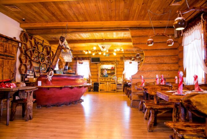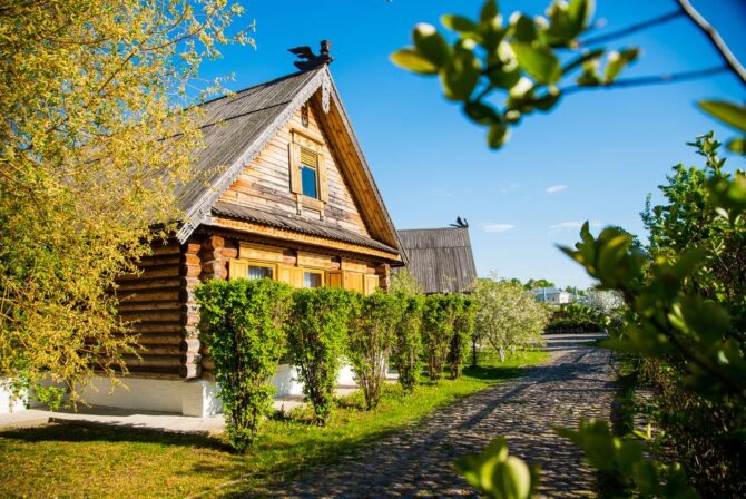 - «Русское подворье» — это отдельно стоящие гостевые домики, находящиеся в импровизированной русской деревушке 18 века. Сотрудники по требованию предоставляют электрический чайник, сушилку для белья, утюг и посуду.