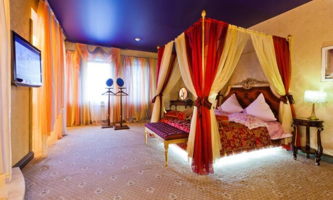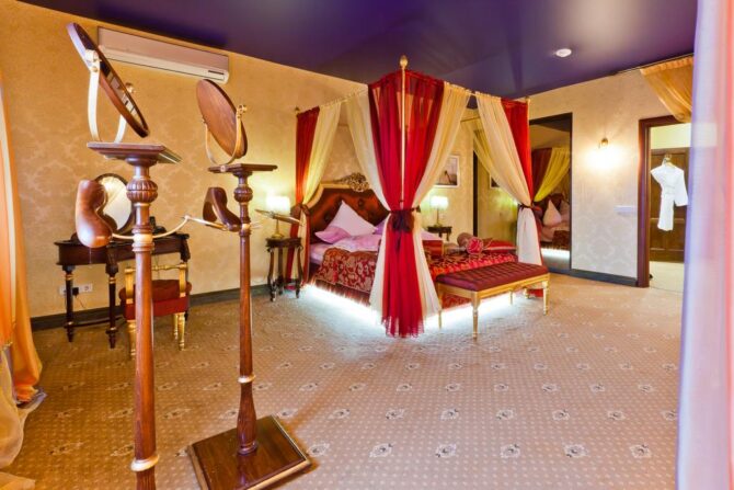 - Люкс «Любимый». Только представьте, здесь все создано, будто вы оказались в одном из парижских будуаров. В двух спальнях установлены кровати с балдахинами и подсветкой, подвесной телевизор, камин, телефон, шкаф-купе, восточная лежанка с декоративными подушками, джакузи. И все это всего за 12500 рублей в сутки.
