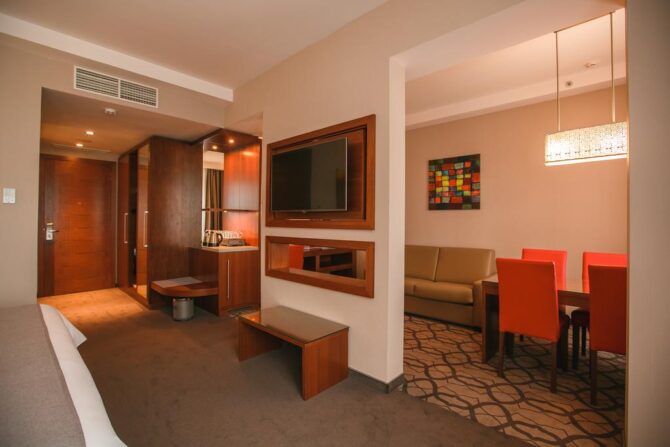 Всего в главном здании имеется более 200 номеров различного уровня комфортности: от стандартов (30 кв.м) до люксов или апартаментов. Во всех комнатах сделан свежий ремонт, обязательно имеются системы климат — контроля, современная техника и уютная ванная комната. Для удобства гостей предлагается чайный уголок и микроволновая печь в номере, если есть желание перекусить самостоятельно.