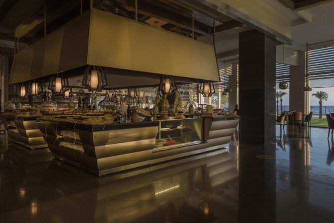 В отеле Rixos Premium Belek 5* все построено на системе «Все включено – Все эксклюзивно». А это значит, что в стоимость проживания уже включены все расходы на еду и напитки. В главном ресторане подается множество блюд турецкой, европейской и азиатской кухни, есть много выпечки, фруктов и десертов. Для малышей разработано специальное меню. Всегда в наличие детские стульчики, для детей, которые самостоятельно принимают пищу, устроена отдельная зона.