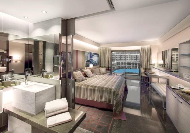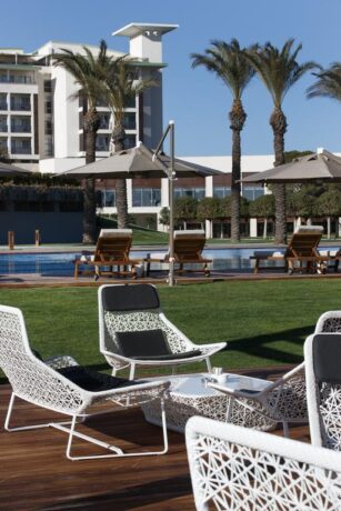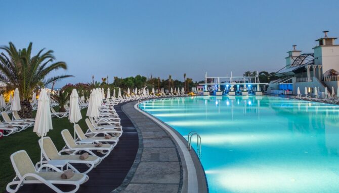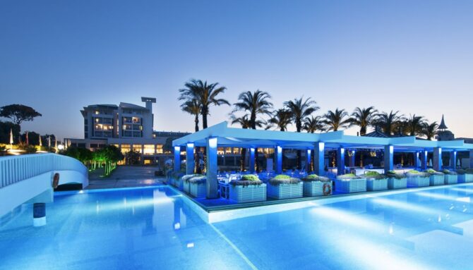 Обсуждаемый нами турцентр захватил обширнейшую территорию в 100000 квадратных метров. Естественно, на этой территории расположились не только жилые корпуса, оборудованные под номера для постояльцев. Здесь построено большое количество объектов общественного питания, несколько бассейнов, впечатляющий своими размерами аквапарк, площадки для занятий спортом, приватная линия пляжа, конференц-залы, сады и многое другое.