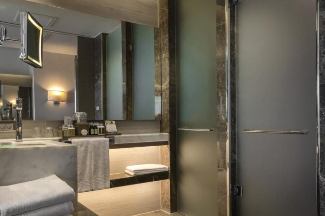 В просторных ванных комнатах есть все для того, чтобы постояльцы могли принимать душ или ванну. Гигиенические принадлежности, а также полотенца, фен, тапочки и халаты предоставляются бесплатно. Как утверждают гости, полы здесь не скользкие, а запах сырости никогда не ощущается.