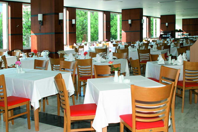 Основной ресторан работает по системе «все включено», поэтому вы можете попробовать любое предложенное блюдо на выбор. Есть детское и диетическое меню. Можно воспользоваться стульчиком для кормления малышей, микроволновой печью и блендером для приготовления еды детям до двух лет.