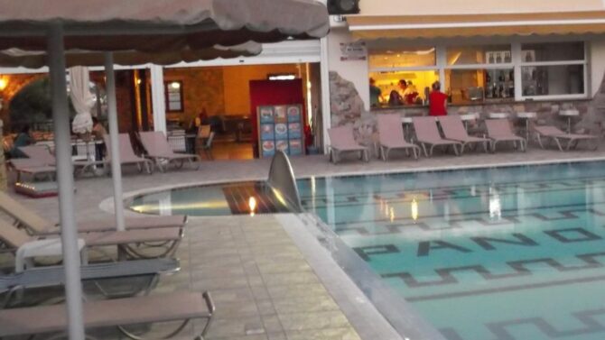 Отель Panorama Studios Apartment расположен на окраине поселка Фалираки ( до центра с магазинами примерно 1.5 км) на склоне лесистого холма. Чтобы добраться до него, нужно преодолеть недлинный, но крутой подъем. Отель состоит из двух трехэтажных корпусов с бассейном между ними. В первом корпусе — небольшая лаунж зона и кафе с барной стойкой. Она же заменяет ресепшн. Отель хорошо вписывается в красивую холмистую местность, с верхних этажей открывается прекрасный вид на поселок и море. Двери номеров выходят на открытую галерею, куда заглядывают ветки сосен, растущих на холме. Около отеля большая автостоянка.