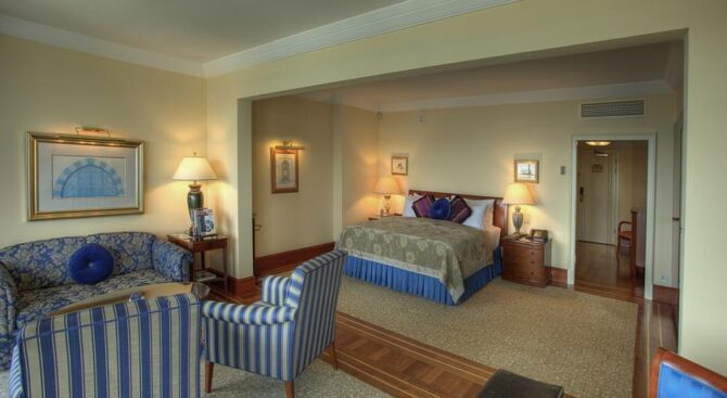 Отель располагает несколькими видами номеров, включая люкс «Дворец». В комнатах к услугам гостей мягкая мебель, удобные кровати, спутниковое ТВ и холодильник для охлаждения напитков. Ванные комнаты украшены мрамором и оснащены современной сантехникой.