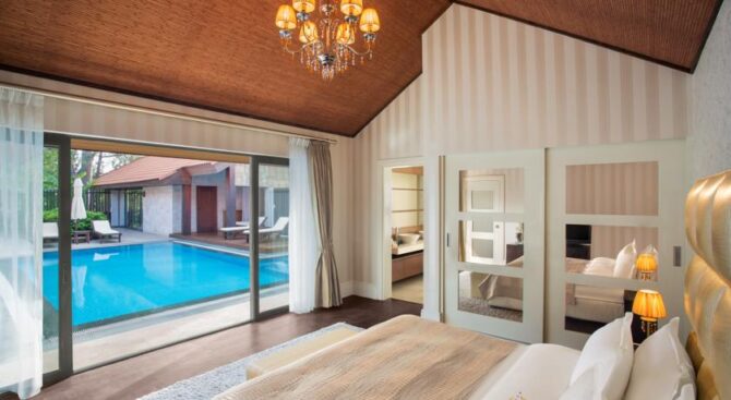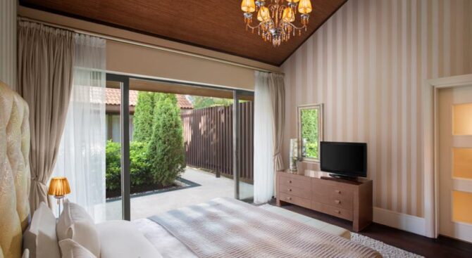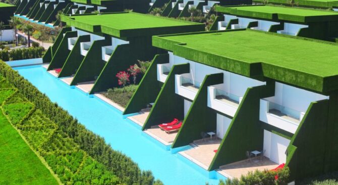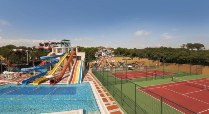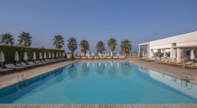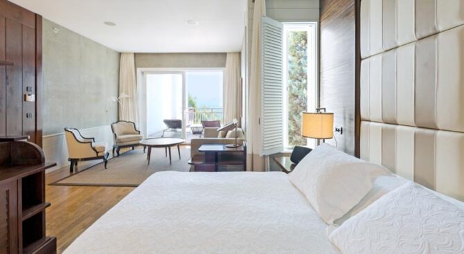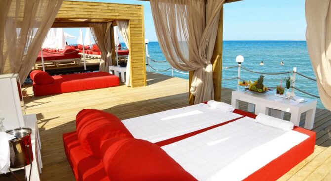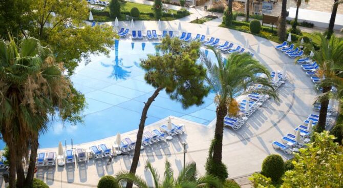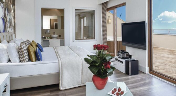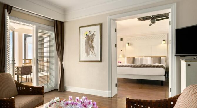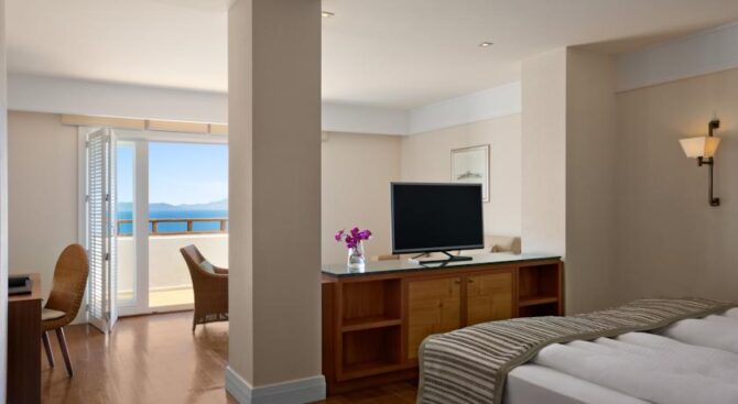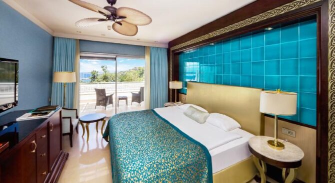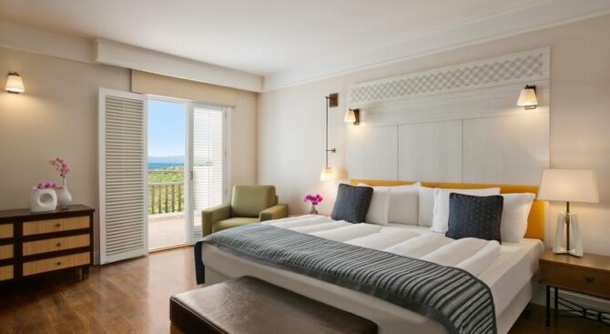 Великолепный отель с огромной территорией и собственным пляжем. Отдых здесь будет роскошным в окружении красивого зеленого парка, бассейнов и удобных зон отдыха с шезлонгами и навесами. В просторных апартаментах, рассчитанных на 2 или 3 гостей, есть удобные гардеробные системы для хранения вещей, кровать и диванная группа, ТВ и кофе-машина. Во всех апартаментах есть выход на меблированную террасу.