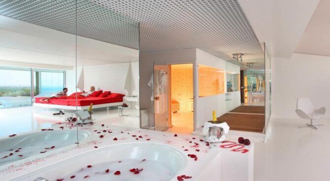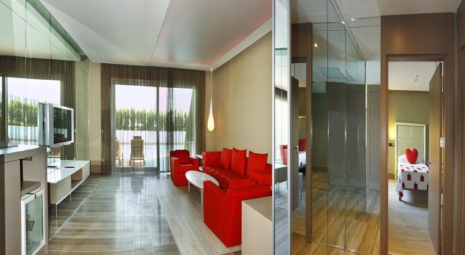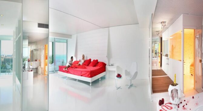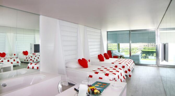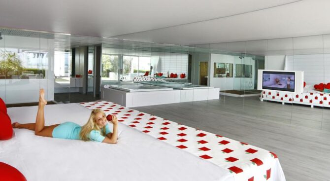 Adam & Eve – Adults Only – только для взрослых. В его элегантных номерах с зеркальными стенами, белоснежной мебелью и ярко-красными акцентами в отделке можно провести незабываемый «медовый» месяц. В номерах есть большой настенный телевизор, а также гостиная зона и кровать огромных размеров.