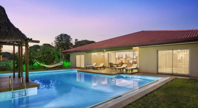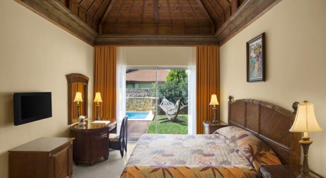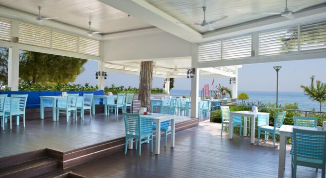 На всей территории отеля в тени зеленых деревьев и в окружении благоухающих цветущих растений расположены столики с зонтиками из соломы. Постояльцы могут воспользоваться двумя плавательными бассейнами или отправиться на пляж, где есть не только шезлонги и навесы, но и бары.