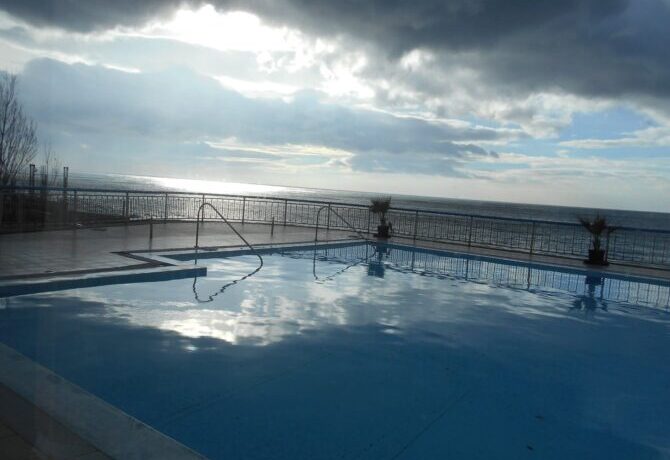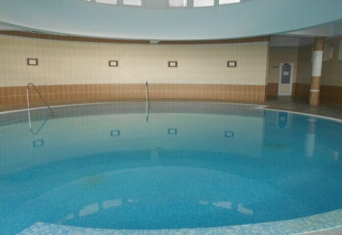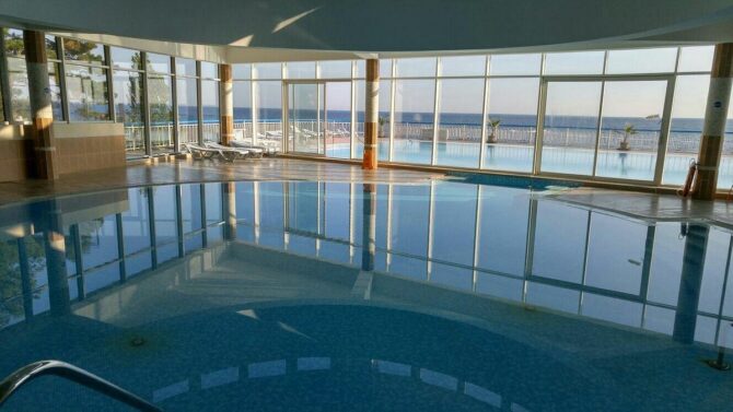 Отель располагает двумя бассейнами. Оба находятся в 3-м корпусе и соединены между собой переходом. Один из них крытый. Его объем составляет 100 кубометров, глубина 1 м 25 см. Второй – открытый, объемом 300 куб. м и глубиной до 3-х метров. Вода морская. Посещение входит в стоимость проживания. Оба работают сезонно, как и сам санаторий, с 1 апреля по 30 ноября. Зимой и в марте гости не принимаются.
