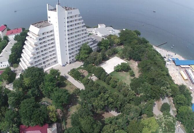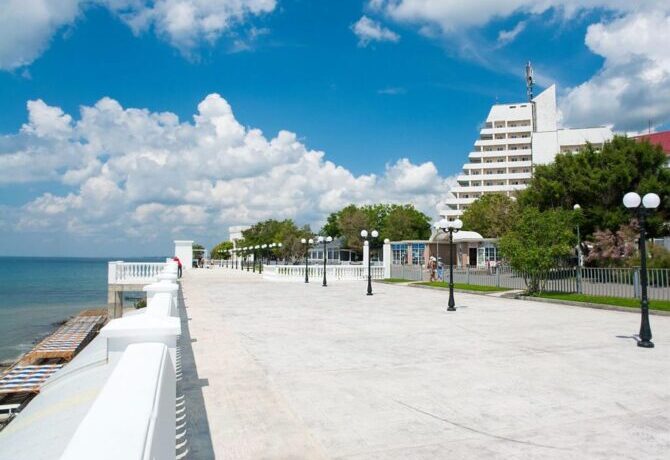 Территория санатория засажена зелеными деревьями и необычными цветниками. Есть несколько открытых бассейнов. Кроме того, есть отдельная спортивная площадка, которая оснащена всем необходимым для регулярных занятий спортом. В процессе оздоровления это как нельзя лучше. Санаторий создал максимально комфортные условия для посетителей. С нескольких сторон здание опоясывается набережной. Это самое любимое место отдыхающих. Прилегающая набережная напоминает старинный стиль. Смотровая площадка открывает роскошный вид на море. Ее уникальность в том, что данная площадка за время своего существования стала площадкой для киносъемок и различных фотосессий.