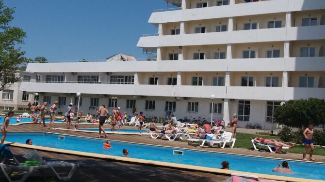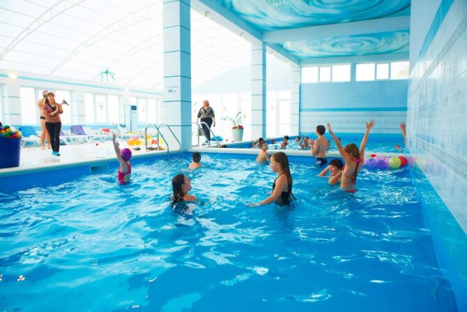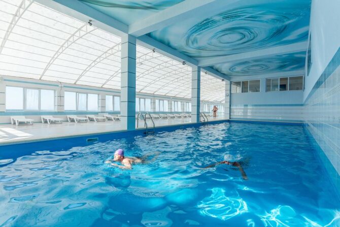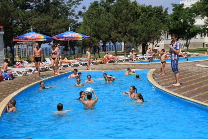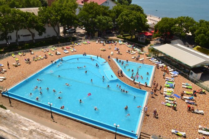 Санаторий предлагает бассейны с морской водой. Это уникальное место для отдыха. Регулярно в бассейне проводят водные состязания среди посетителей, а также делают мастер-классы по аквааэробике. Для детей предлагается бассейн с теплой морской водой. Мы понимаем, насколько важно правильно разнообразить детский досуг. Именно поэтому мы приготовили уникальную развлекательную программу с конкурсами и аниматорами. Территория возле комплекса также оборудована под зону отдыха. Вокруг устанавливаются шезлонги, чтобы гостям было максимально комфортно загорать.