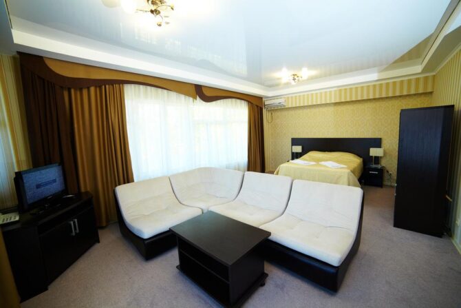 На данный номер санаторий имеет категорию 3 звезд. Одновременно возможно пребывание более тысячи гостей. Всего 4 комплекса. В номерах есть все необходимое для максимально комфортного проживания. Номера разделены на несколько категорий. Служба размещения постояльцев расположена в 3 корпусе и работает 24/7. Во время регистрации каждый посетитель получает именную карту и пластиковый ключ. Он понадобится для посещения лечебных кабинетов и столовой. Также каждый гость получает браслет, который является своего-рода пропуском и действует не только на территории санатория, но и на пляже. Первый этаж комплекса является максимально развлекательным. Здесь есть все: и библиотека, и конференц-зал, также находится игровая компота для детей.