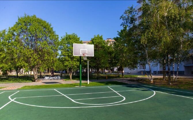 Территория внушительная, есть все необходимое для комфортного проживания с детками. Есть детская площадка, бассейны, развлекательные детские зоны.