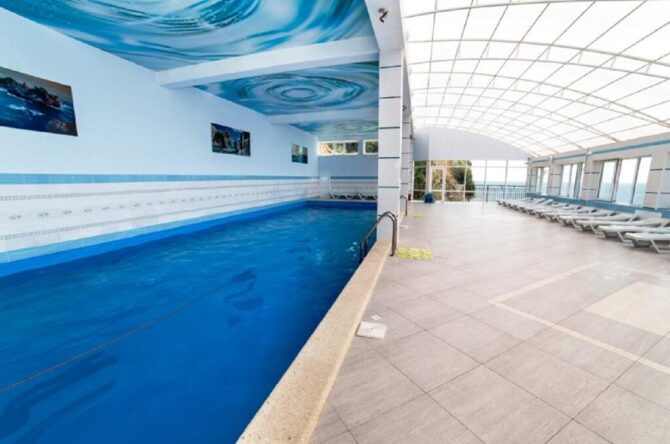 Бассейн закрытого типа расположен в одном из корпусов санатория. Вода используется морская и все время подогревается. Он действует как один из способов оздоровления и назначается исключительно врачом после консультации. Водный процедуры очень полезны, особенно со специальными оздоровительными программами, которые были разработаны специалистами в соответствии с течением болезни. Сеансы возможны только с шапочками для купания.