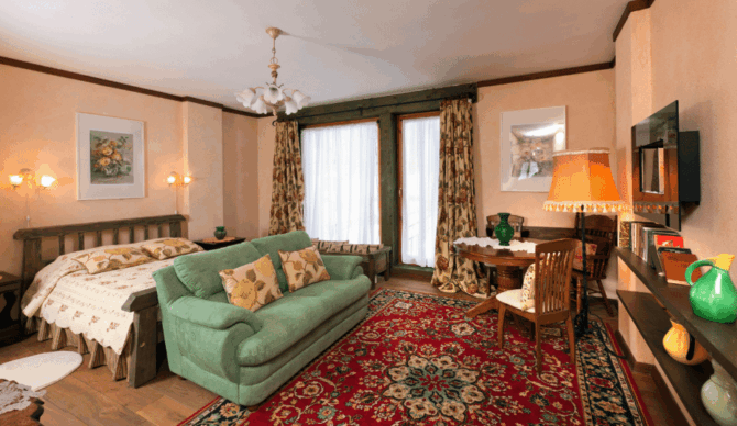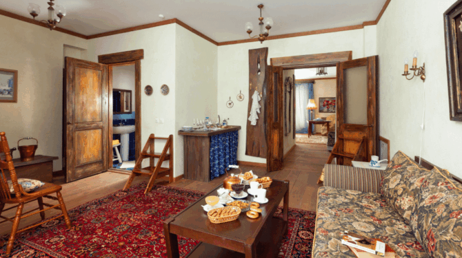 В номерах «люкс» и «полулюкс» – с камином или террасой, а также категории «комфорт» – оборудованы две отельные комнаты: по-домашнему уютная гостиная и комфортабельная спальня. Отдыхающим за дополнительную плату предоставляется возможность арендовать самые разные предметы быта и спортивное снаряжение: