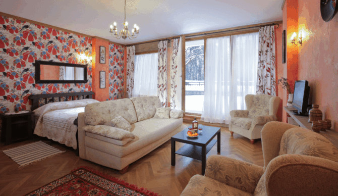 Апартаменты гостиничного комплекса «Таежные дачи» расположены в арт-отеле «Клен». Дома-шале представлены отдельными деревянными постройками, где гости найдут все необходимое оборудование и мебель для комфортного проживания. Стоимость, актуальная для мая 2021 г., начинается со следующих цен за одни сутки для двух отдыхающих (в рублях):