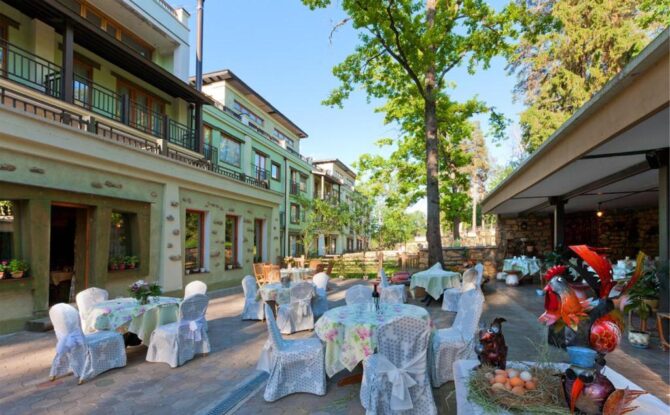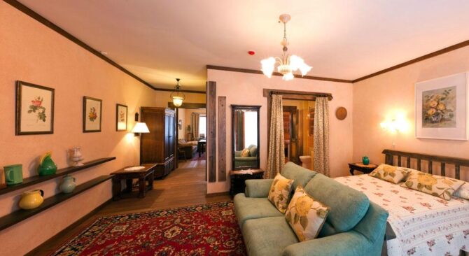 Из каждого номера гостиницы открывается вид на живописный сад, где растут хвойные и лиственные деревья. В комнатах есть все самое необходимое, чтобы гости чувствовали себя комфортно вдали от цивилизации: