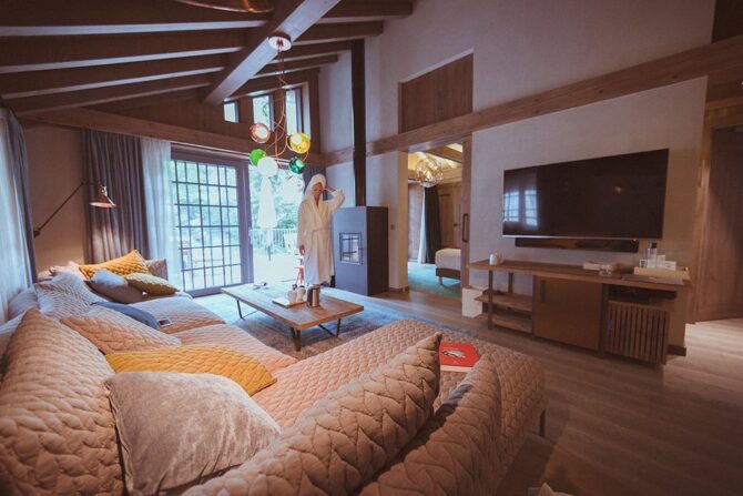 Номерной фонд располагаются в уютных шале, подготовлены как для проживания вдвоем, так и большой семьей с детьми. Отделка натуральным деревом и современная мебель создают комфорт и тепло. С балконов открываются прекрасные виды на сад и горы. Гости питаются по системе шведского стола или континентального завтрака по утрам, на территории есть несколько ресторанов европейской кухни.