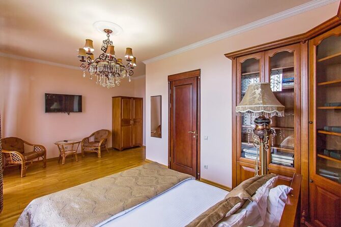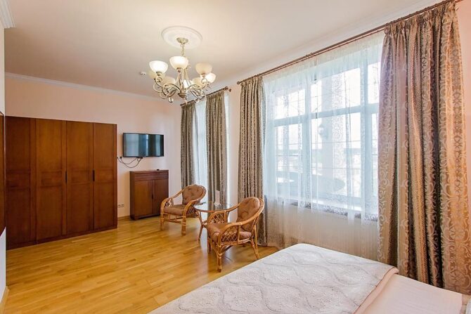 Наиболее комфортным вариантом считается просторный люкс, располагающийся на верхних этажах в коттеджах. С балкона будет открываться превосходный вид на природу, а комнаты будут наполняться свежим лесным воздухом. Плюсом апартамента является то, что он подойдет постояльцам, желающим жить отдельно от большинства путешественников – коттеджи стоят на территории обособленно.