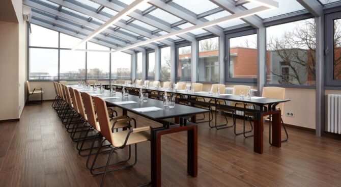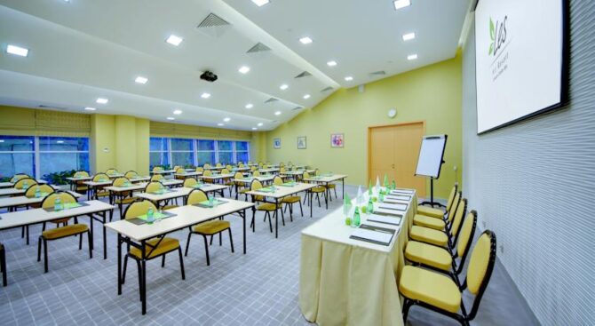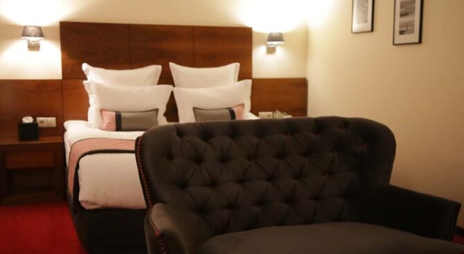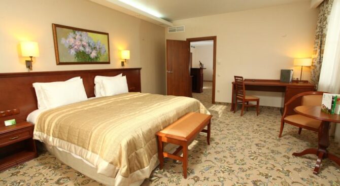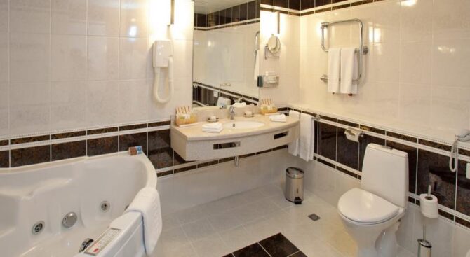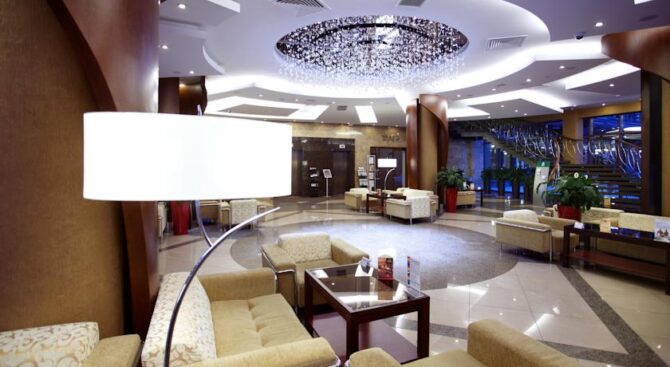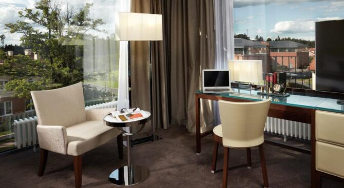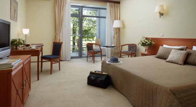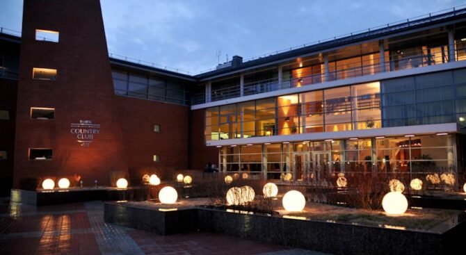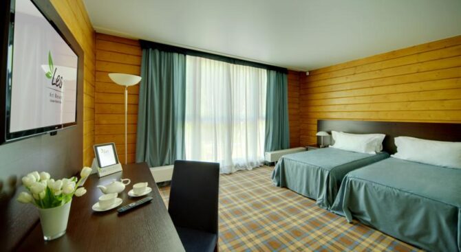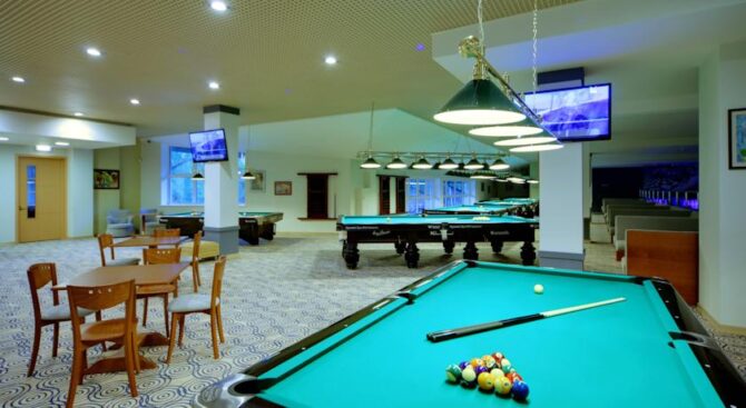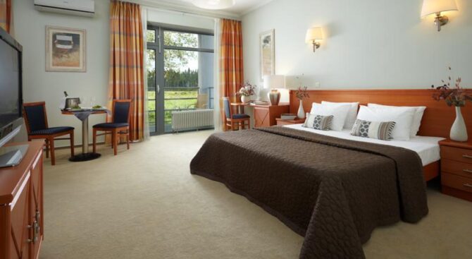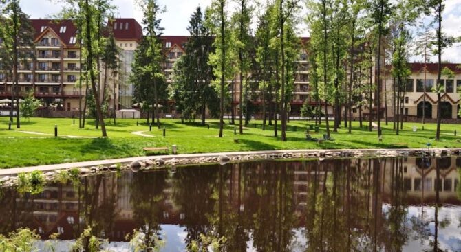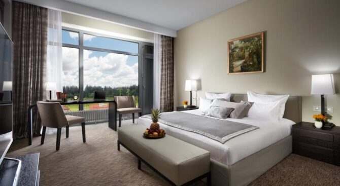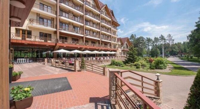 Большой спортзал Grand Arena Hall рад предложить постояльцам отеля развлечение на любой вкус – игру в теннис, боулинг или пострелять по мишеням. Понравится гостям и конная прогулка, а также прокат велосипедов, на которых можно проехаться по дорожкам еловых лесов, окружающих отель. Но самым главным достоинством заведения является бассейн, который расположен на 25 метров и огромный спа-центр. Доехать до отеля из столицы можно за небольшое время.