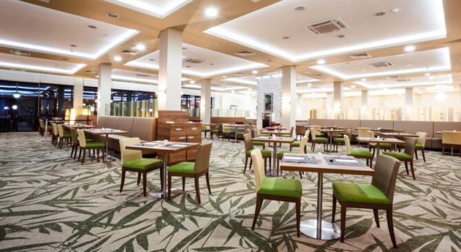 Ресторан, расположившийся на территории отеля, славится своей традиционной европейской кухней. Блюда не оставят равнодушным даже самого взыскательного гурмана. Также в «Гео Спа» находится мини-пекарня, выпекающая свежее ароматное печенье и хлеб. Для тех, кто следит за своим здоровьем гостеприимно распахнуло свои двери фитнес-кафе. Также имеется бар с ассортиментом напитков на любой вкус.