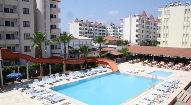 На территории внутреннего двора комплекса построен бассейн с одной водной горкой. Возле него регулярно проводятся шоу с участием аниматоров. Они завлекают постояльцев в групповые соревнования, превращают ленивое лежание на солнце в увлекательное приключение с возможностью знакомства и общения с людьми, проживающими в соседних номерах. Тут постоянно ведутся уроки аэробики, поэтому вы можете при желании вернуться из отпуска не только загорелыми, но и физически подтянутыми.