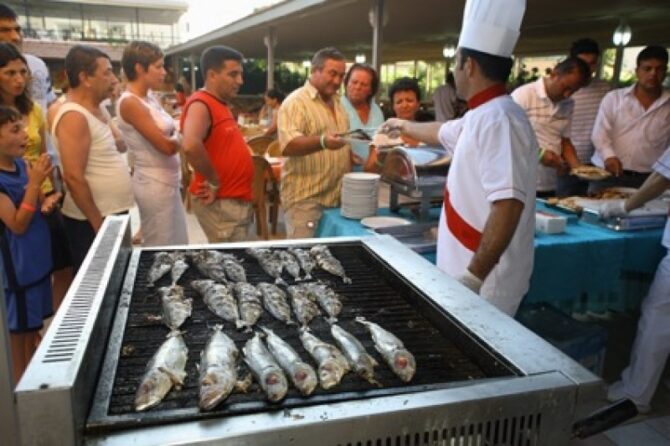 В главном ресторане каждый день проходят основные приемы пищи. Для ранних пташек завтрак начинается в 7.30 и заканчивается через два часа. Обед, конечно же, подается в период с 12.30 до 14.00, а ужин с 19.00. В перерывах между ними у бассейна подается чай и свежая выпечка, работает бар практически до полуночи. В нем у вас есть возможность заказать прохладительные напитки и коктейли.