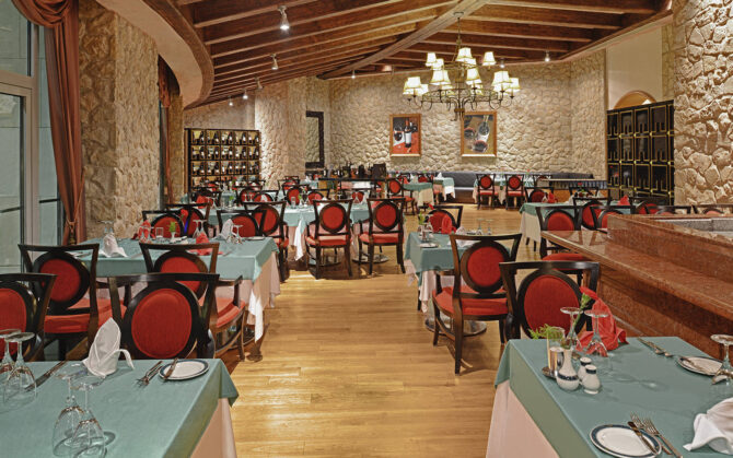 Основной ресторан, находящийся в главном корпусе, вмещает в себя 600 человек. Столики размещены в двух просторных залах, а также часть из них вынесены на террасу. Уютная атмосфера заведения пробуждает аппетит и делает процесс поглощения пищи максимально комфортным.