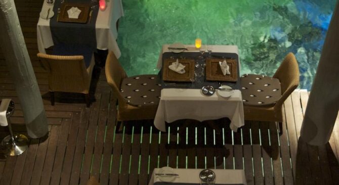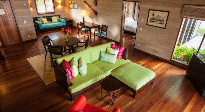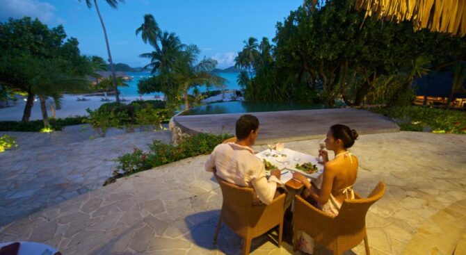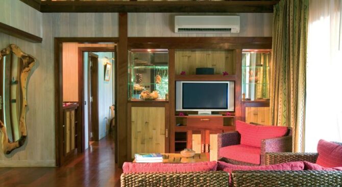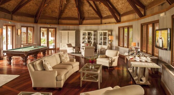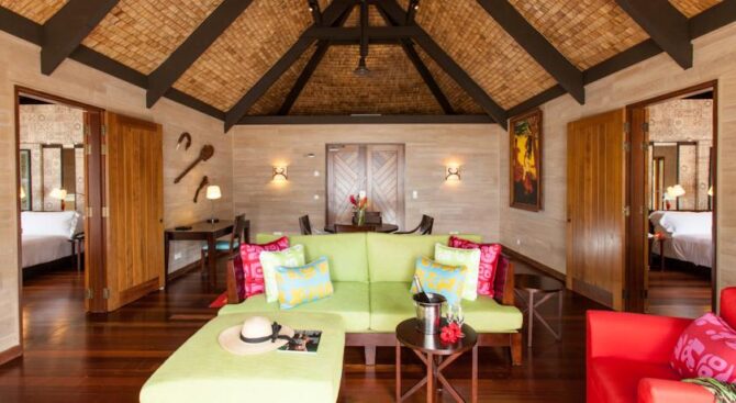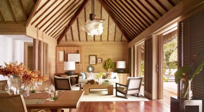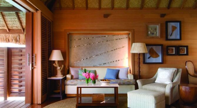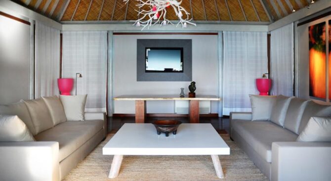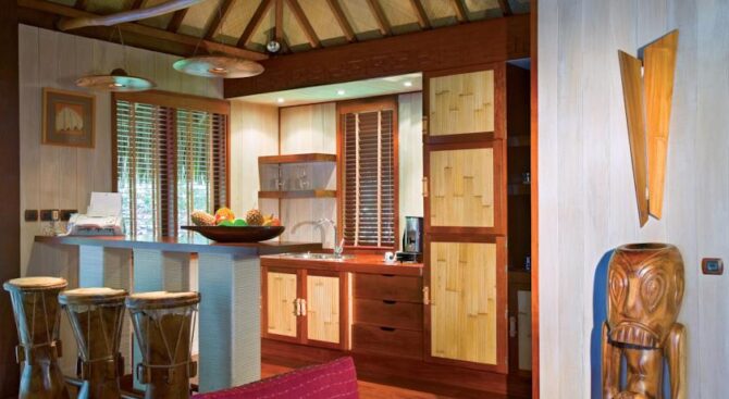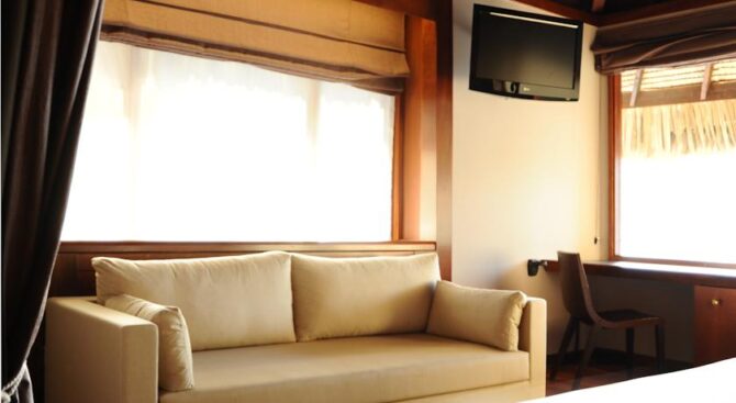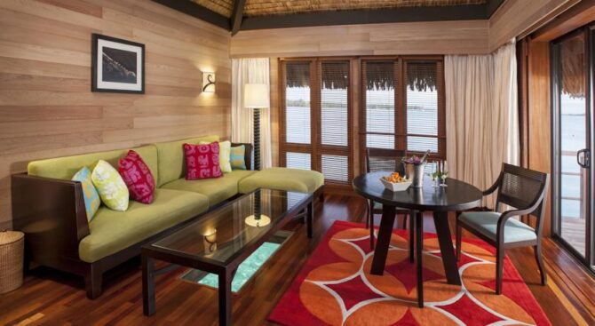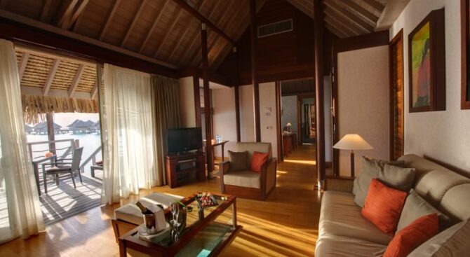 В каждой вилле имеется комфортная гостиная, оснащенная телевизором и кондиционером. Просторная терраса оборудована удобными шезлонгами, на которых туристы могут насладиться солнечными ваннами. С каждой террасы можно выйти к идеально прозрачной воде лагуны. Постояльцам этого курортного комплекса на Бора-Бора предлагается множество блюд на выбор, которые можно отведать в помещении, оснащенном кондиционером или на террасе.