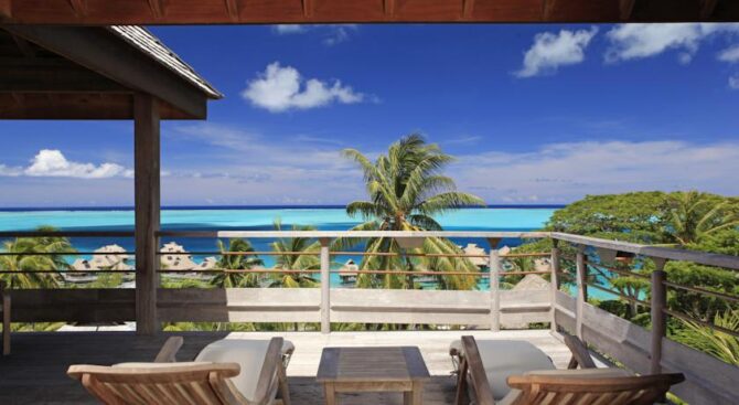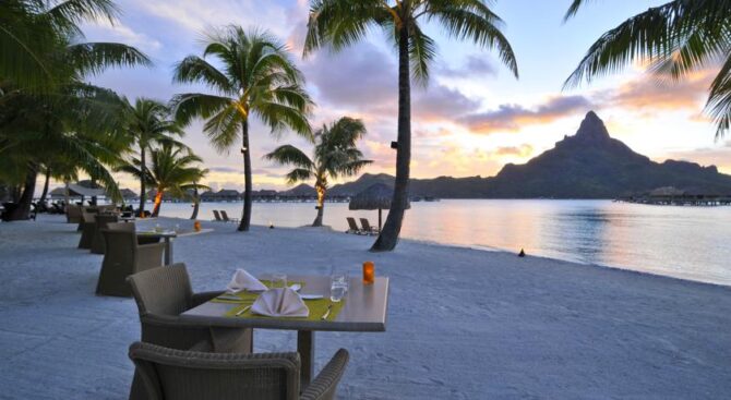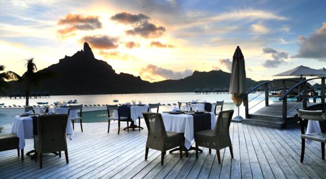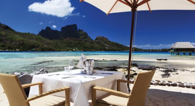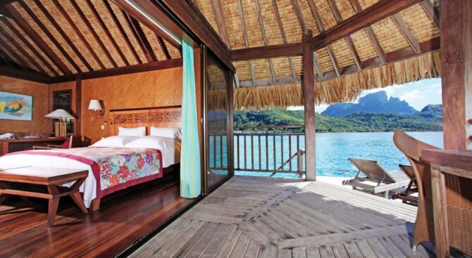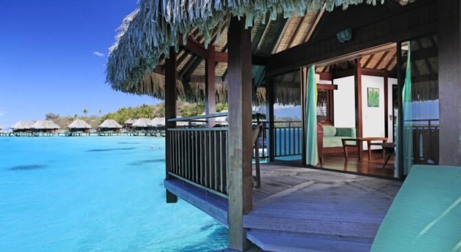 Этот отель категории 5 звезд оснащен комфортным спа-центром, в котором каждый турист может заказать расслабляющие процедуры. Заведение располагает собственным пляжем с белым песком и комфортными номерами, которые построены в виде вилл. Каждая из них находится прямо над водной гладью и оснащена просторной террасой, из которой открывается великолепный вид на Бора-Бора.