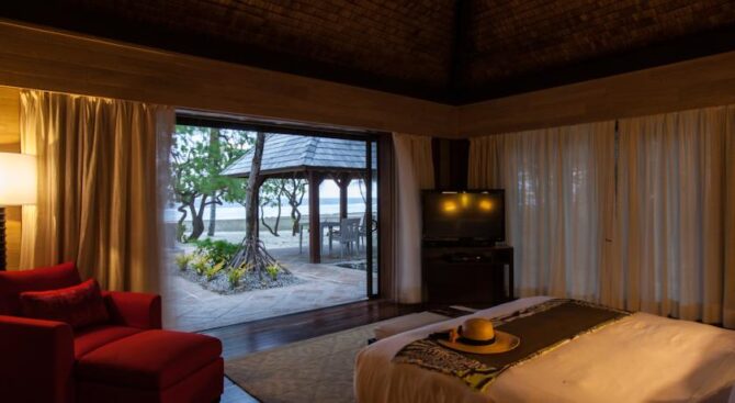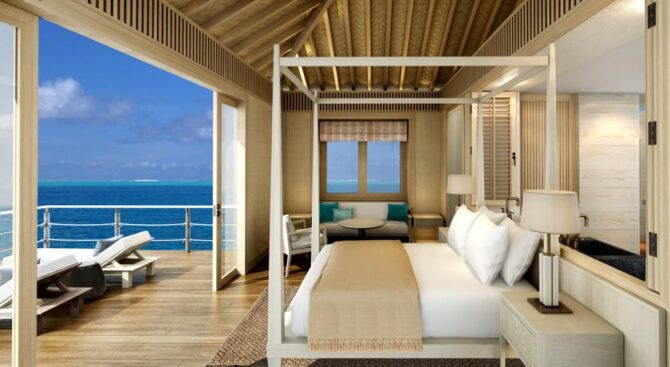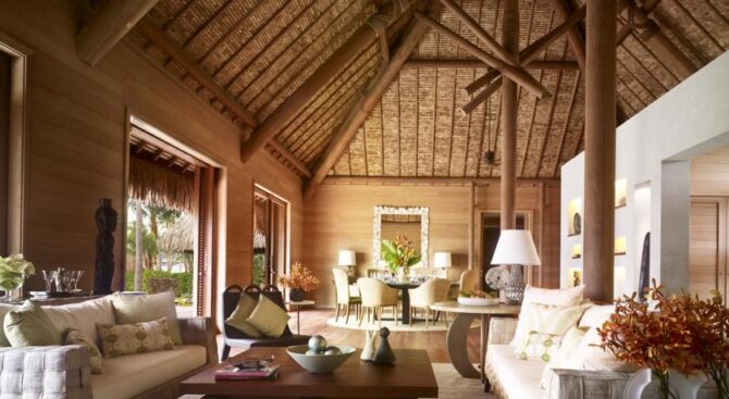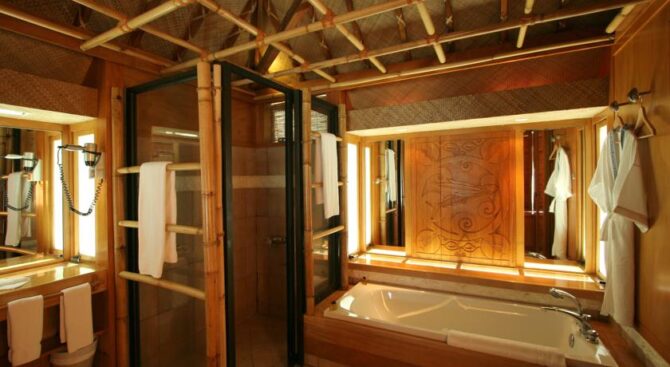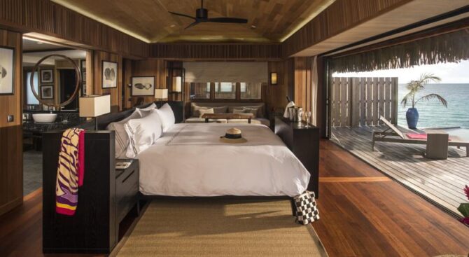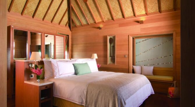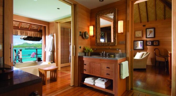 Среди удобств, – кондиционер и современная ванная, задекорированная мрамором. Кроме того, все виллы The St Regis Bora-Bora Resort украшены скульптурами ручной работы в полинезийском стиле. Некоторые апартаменты оснащены своим небольшим бассейном, душем на открытом воздухе или гидромассажной ванной.