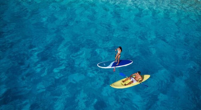 Можно отдыхать на удобных пляжных шезлонгах, а можно заняться подводным плаванием (всем необходимым снаряжением обеспечит отель) и каякингом.