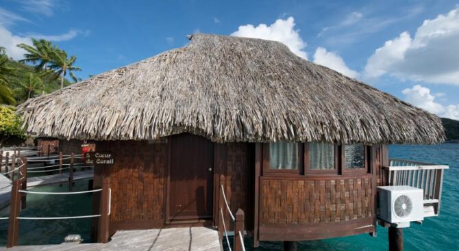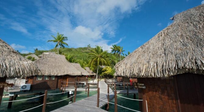 От отеля можно очень быстро дойти до пляжа с чудесным белым песком. Это заведение с первого взгляда поразит туристов своим роскошным видом, приезжающих на Бора-Бора в поисках лучшего отдыха. В качестве номеров здесь выступают комфортные бунгало, располагающиеся прямо над водной гладью.