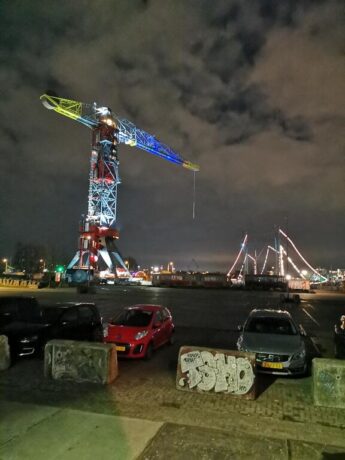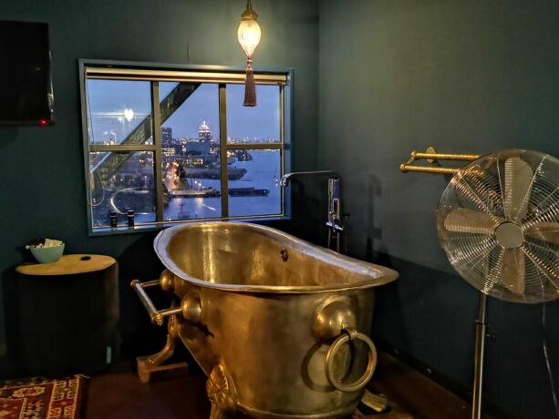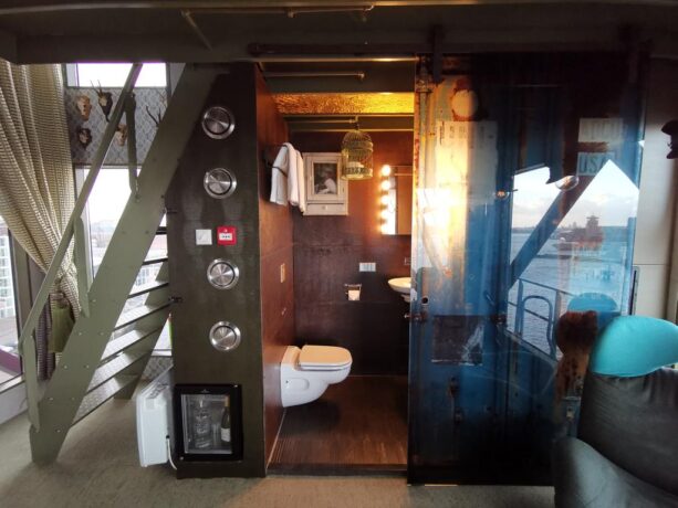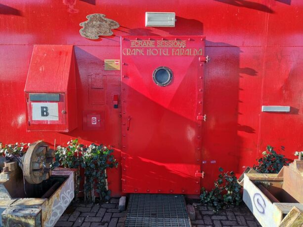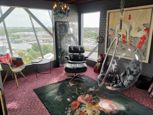 Отель возвышается над районом NDSM Wharf. Захватывает не только вид, который можно увидеть внизу, но и то, что можно увидеть вокруг. В верхней части есть гидромассажная ванна и, конечно же, канат для тех, кто любит экстрим и желает прыгнуть с крана. А если надо отправиться в центр Амстердама, есть бесплатный паром, который доставит туда за 10 минут. Номера на Фаральде относительно труднодоступны (как и следовало ожидать, учитывая тот факт, что они встроены в башенный кран). В отеле всего три номера-люкса, каждый из которых имеет свою уникальную тематику и дизайн.