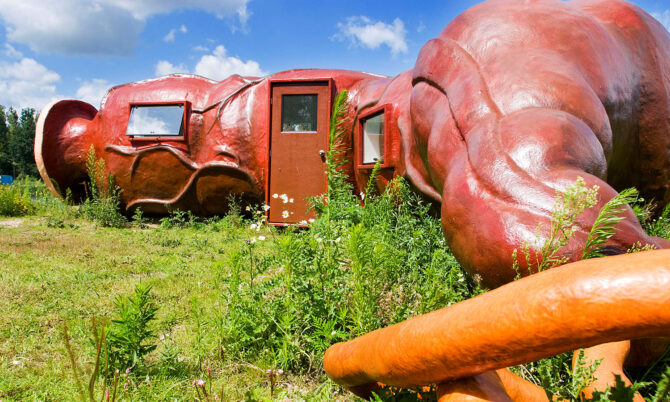 Отель Dog Bark Park Inn, расположенный на окраине небольшого городка Коттонвуд, — это настоящий рай для тех, кто прекрасно понимает, кто лучший друг человека. Тот факт, что отель рассчитан на любителей собак, лишь смутно намекает на то, что он имеет форму гигантского пса. И если этого недостаточно то, то что действительно отличает этот отель от других, так это то, что для того, чтобы получить доступ к номеру, гость должен подняться по лестнице и войти через прямую кишку собаки.