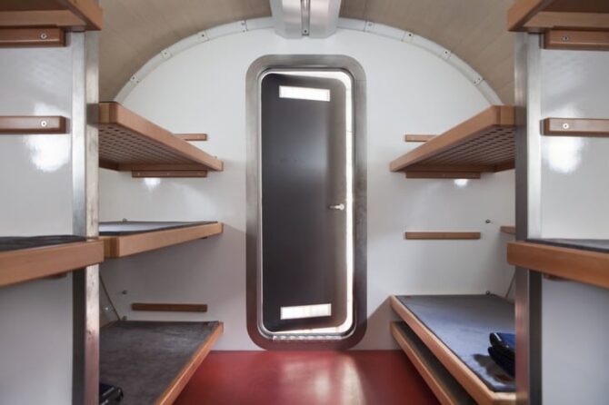 Честно говоря, 9,5-тонные люксы больше похожи на то, куда можно забраться в качестве крайней меры во время ядерного апокалипсиса: когда часы судного дня достигают полуночи и в небе начинают цвести грибные облака. Декор, состоящий из высокого матраса и лампы, не вызывает экстравагантного восторга. Но есть электрическая розетка для зарядки вашего мобильного телефона или фонарика. Но все же, там много места, чтобы растянуться и подождать, пока ядерные облака пыли пролетят мимо.
