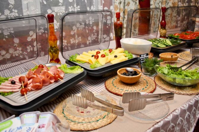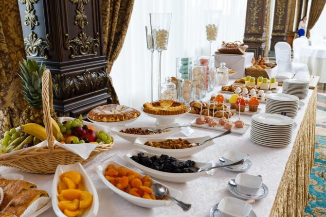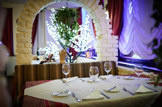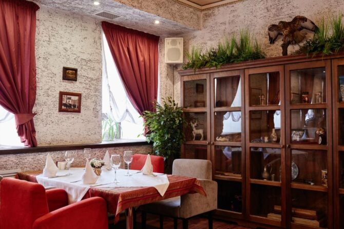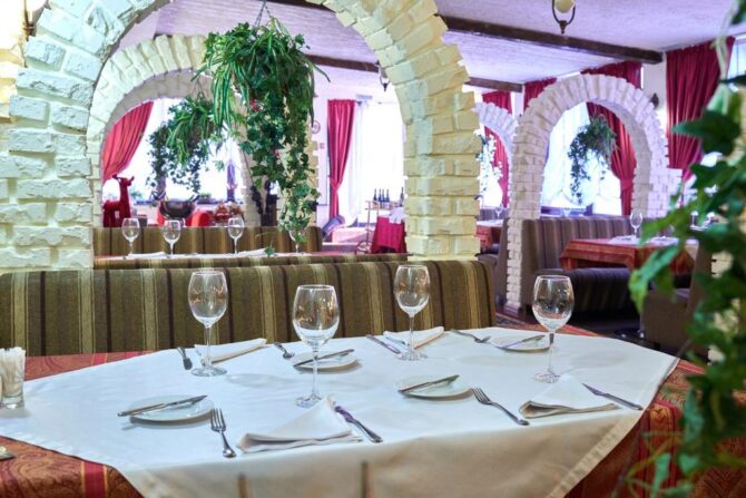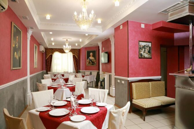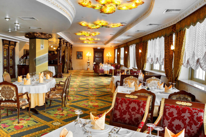 В ресторане «Царский двор», славящемся хорошей русской кухней, обслуживают по меню (можно выбрать специальные лакомства для детворы). По желанию гостей еду принесут в апартаменты.