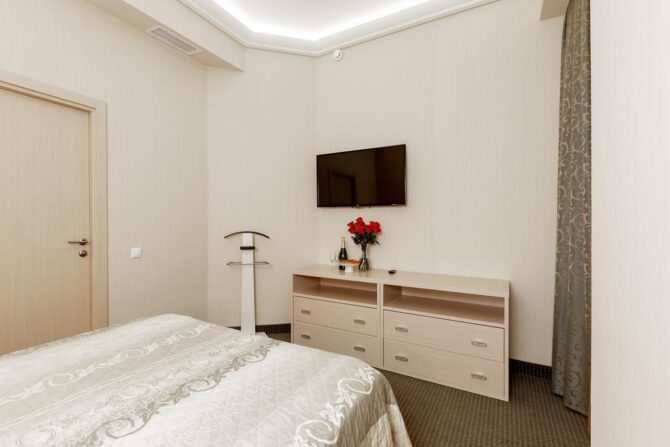 Оформление комнат выполнено в приглушенных бежевых оттенках, апартаменты подразделяются на несколько категорий: улучшенный сьют, стандартный, представительские, эконом-студия.