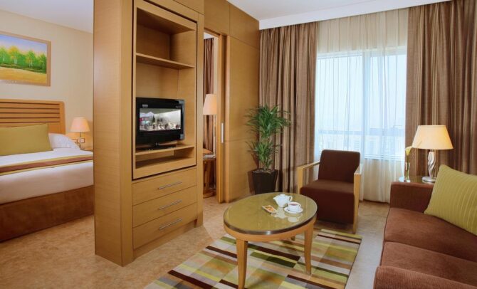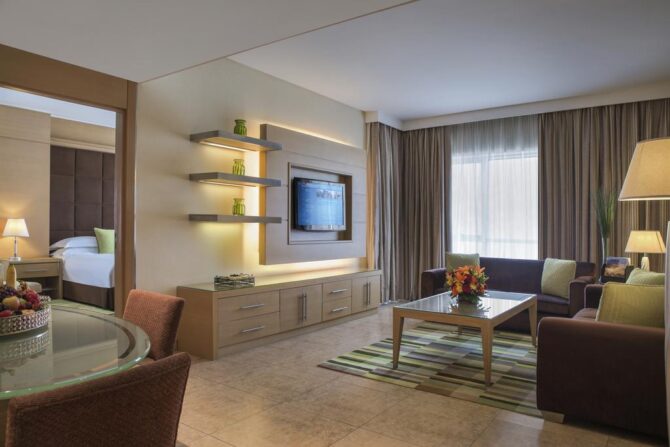 Nour Arjaan by Rotana | 1,2 км от аэропорта | Классик Люкс | Кофемашина Кухонная техника Доп.ванная Рабочее место Пресс для брюк Столовая | Массажный кабинет Fitness Клуб для малышей и подростков Боулинг-центр Тематические ужины | От 46 евро в сутки/до 11 лет бесплатно | Нет |