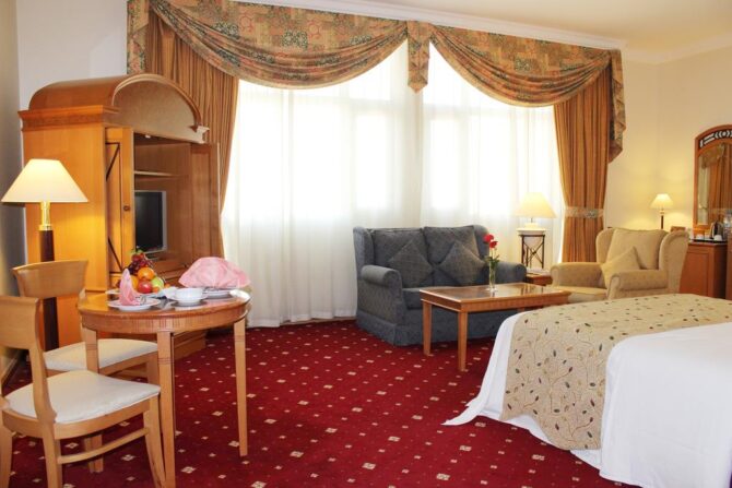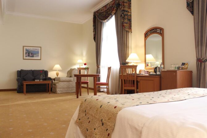 Апартаменты этой пятизвездочной гостиницы укомплектованы не только качественной техникой и мягкой мебелью, но и оборудованной мини-кухней. Если вы предпочитаете питаться самостоятельно, сотрудники предоставят необходимую посуду, полотенца и другие принадлежности для приготовления еды. А купить недорогие продукты можно в супермаркете, расположенном прямо на территории.