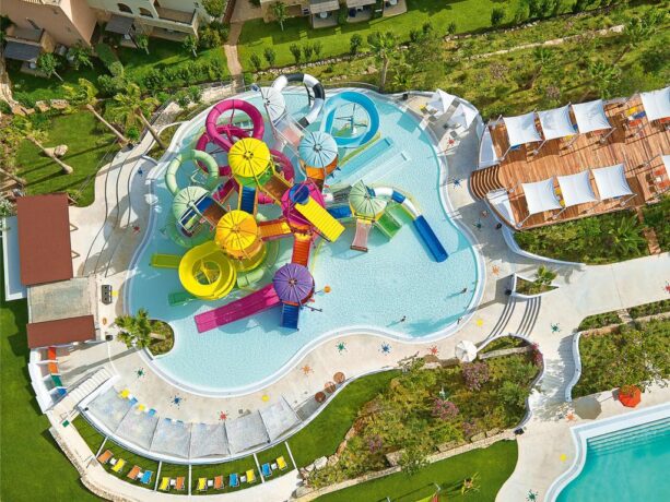 На территории имеется несколько бассейнов (в том числе с игрушками, водными горками и безопасным спуском), игровые комнаты, развлекательный клуб для подростков и младших школьников. Пока за ребятами присматривают специалисты, вы можете насладиться СПА-процедурами, оздоровительным массажем, или просто позагорать на террасе.