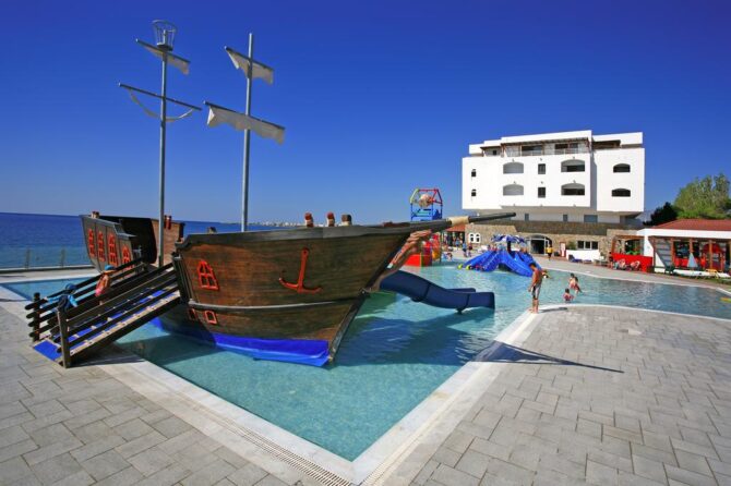 В списке удобств шикарного клубного отеля, расположенного на берегу чистейшей лазурной бухты – несколько бассейнов открытого и закрытого типа, аквапарк, масса возможностей для занятий спортом, детские игровые комнаты на улице и в помещении.