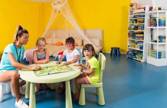 Днем ребята веселятся на игровых площадках под наблюдением анимационного персонала. Если вечером вы захотите посидеть в баре с друзьями или развлечься на дискотеке, можно пригласить профессиональную няню.