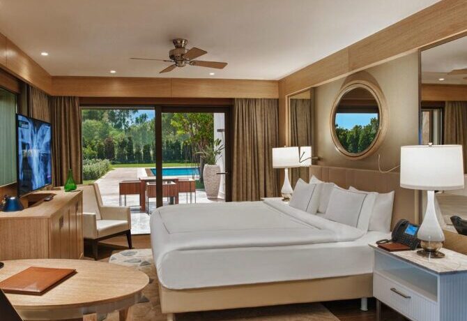 Regnum Carya 19 км от аэропорта Анталия Люкс Семейный Вилла Сейф Уборка Кондиционер ТВ Фен Телефон Мини-бар Чайник Утюг Детская площадка Игровая комната Анимация Детские телеканалы Аквапарк Теннис Водные виды спорта Экскурсии До 12 лет – бесплатно (при размещении на имеющихся кроватях) Нет