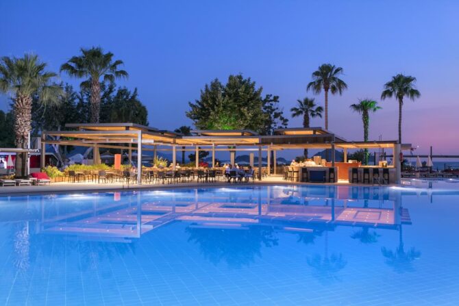 Отель может похвастаться просторной территорией, на которой расположилось несколько бассейнов, в том числе и для детей – с водными горками и небольшой глубиной. Если вы предпочитаете купаться в море, за несколько минут можно дойти до пляжа, заслужившего отметку «Голубой флаг» — это значит, что отдыхать здесь абсолютно безопасно. А для гостей, отдыхающих не в сезон, работает крытый бассейн с подогревом.
