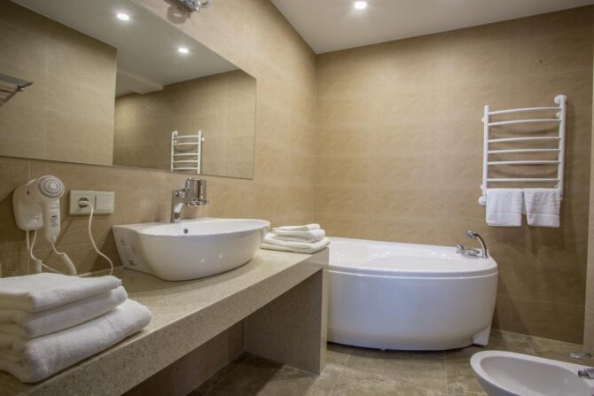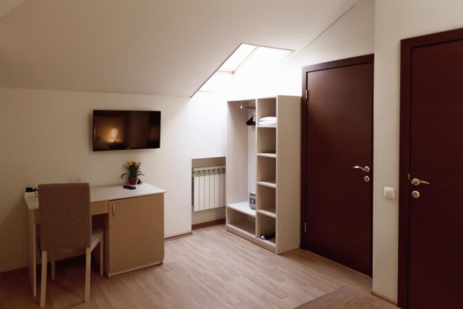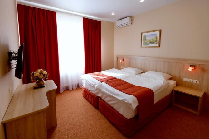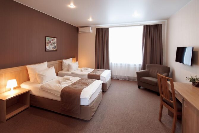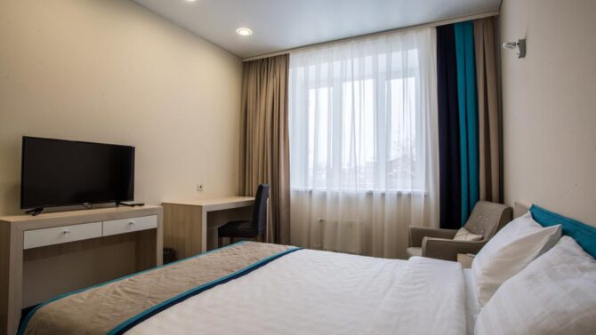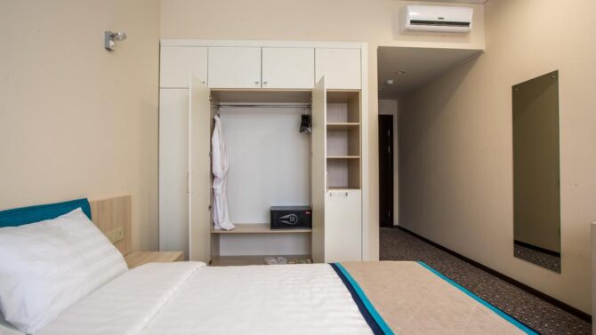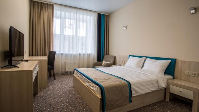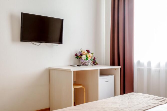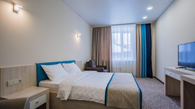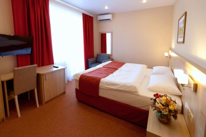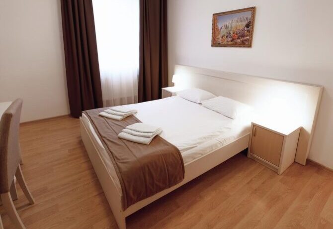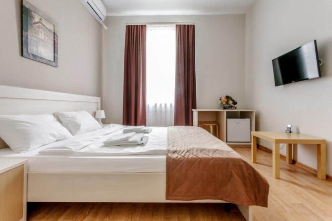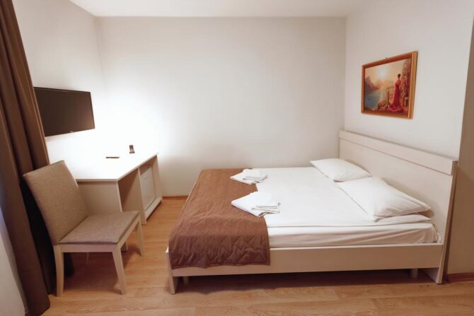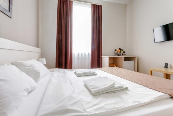 Номерной фонд включает апартаменты от «Эконом» до «Комфорт» класса. Хотите устроить второй половинке романтическое приключение? Рекомендуем вариант Double с гидромассажной ванной, а если пожелаете, комнату дополнительно оформят в изысканном стиле.